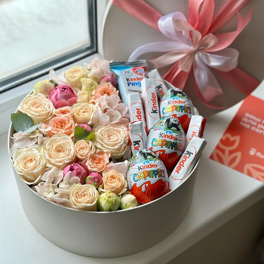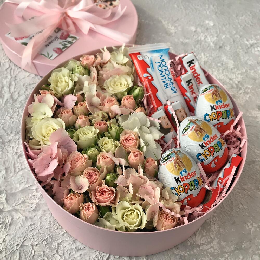 Гортензия - 5 шт. Киндер сюрприз - 3 шт. Киндер шоколад - 5 шт. Киндер молочный ломтик - 1 шт. Коробка с бантом - 1 шт. кустовые розы - 10 шт.