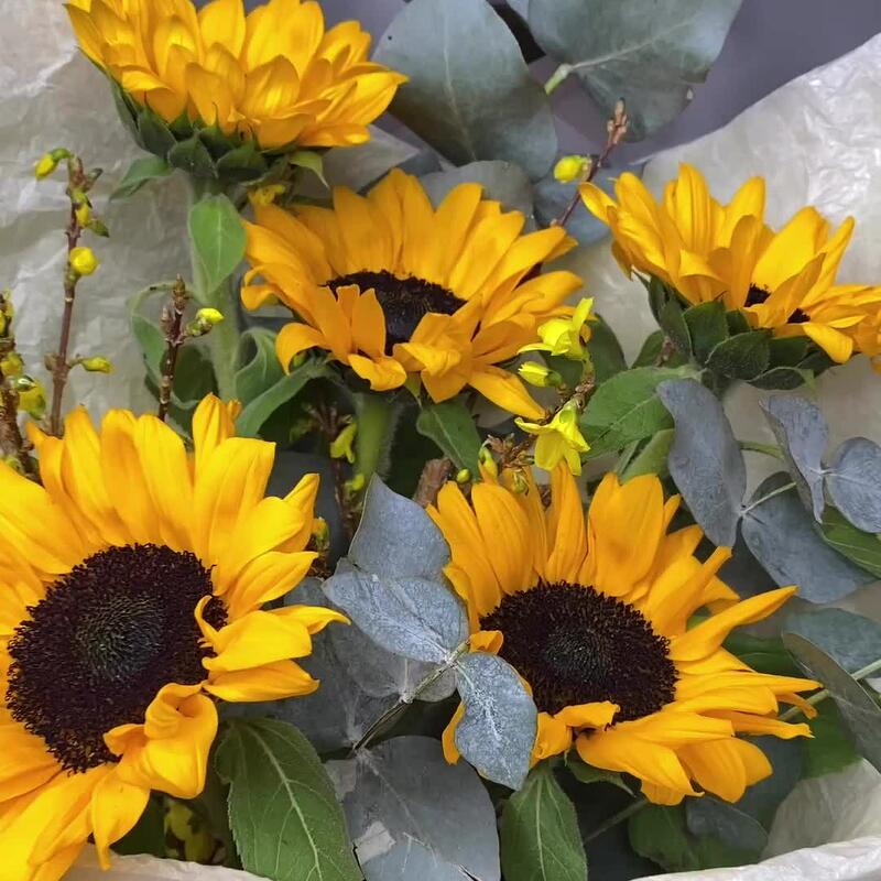 Букет из подсолнухов и веток форзиции привнесёт ярких тёплых красок в ваш дом и наполнит дыханием весны. Форзиция прекрасно стоит в домашних условиях,а ее веточки распускаются в привлекательные желтые цветочки.